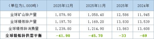 2025年12月全球锌市为供应短缺4.19万吨,11月为供应短缺4.57万吨。由于产量增长不及需求增速,2025年全球锌市为供应短缺3.3万吨,2024年为供应短缺6.9万吨。