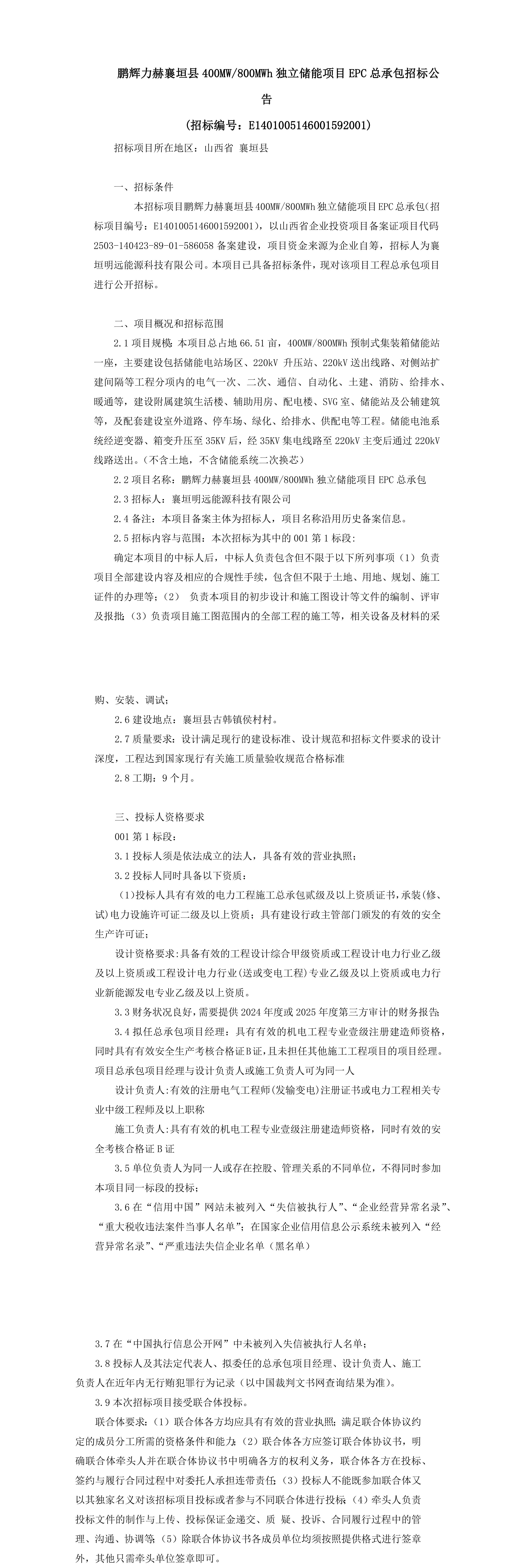 2月24日,鹏辉力赫襄垣县400MW/800MWh独立储能项目EPC总承包招标公告发布,资金由企业自筹。