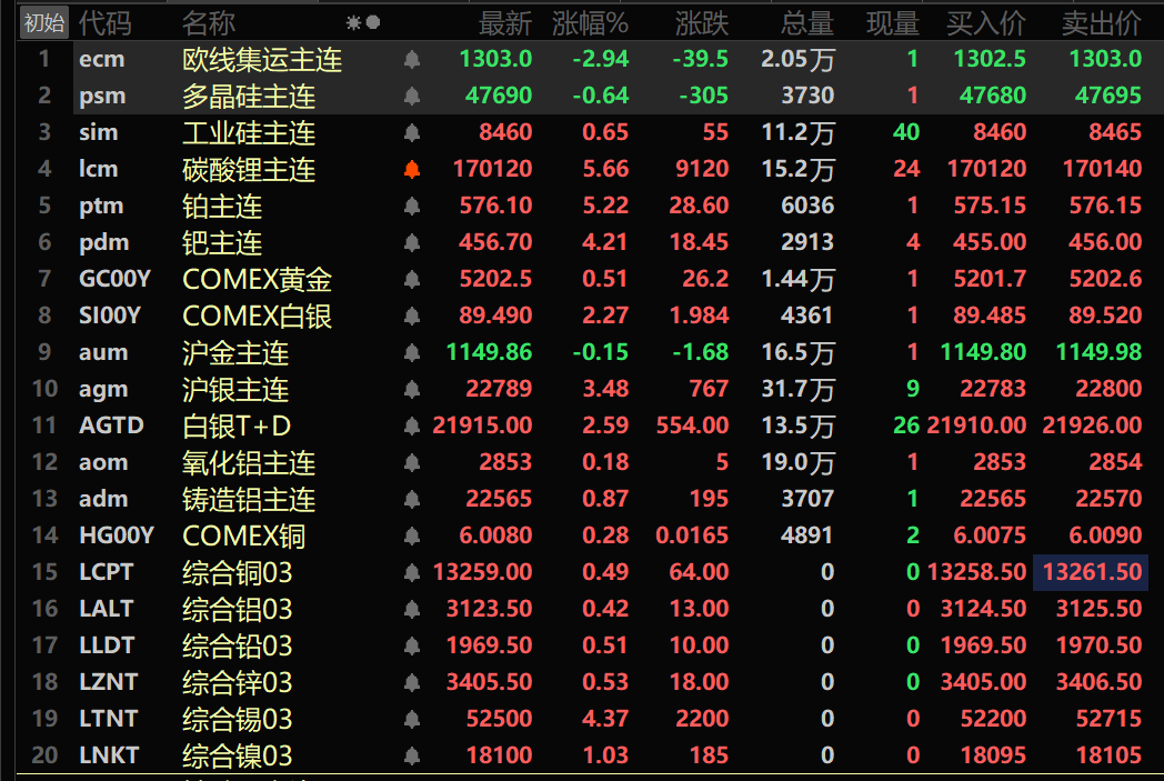 此外,铸造铝主连期货涨0.87%,氧化铝主连涨0.18%。碳酸锂主连涨5.66%。工业硅主连涨0.65%。多晶硅主连跌0.64%。