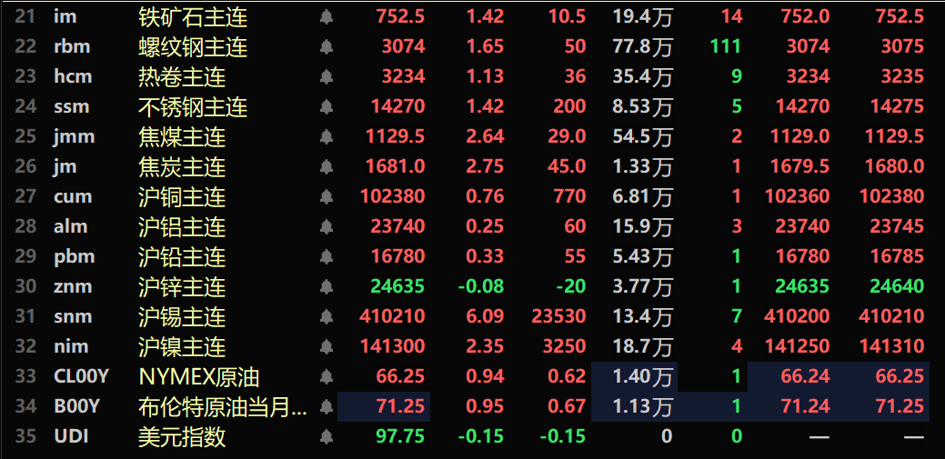 黑色系均飘红,铁矿涨1.42%,螺纹涨1.65%,热卷涨1.13%,不锈钢涨1.42%。双焦方面:焦煤主力合约涨2.64%,焦炭主力合约涨2.75%。