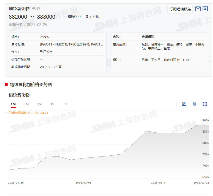据SMM报价显示:2月25日,氧化镨钕价格为880000~890000元/吨,其均价报885000元/吨,较前一交易日持平,而885000元/吨与其2025年12月31日的均价606500元/吨相比,氧化镨钕今年以来上涨了278500元/吨,涨幅为45.92%。