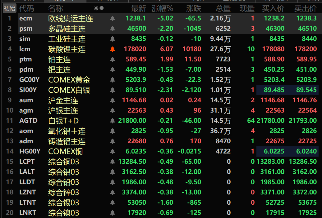 此外,铸造铝主连期货涨0.76%,氧化铝主连跌0.95%。碳酸锂主连涨6.07%。工业硅主连跌0.12%。多晶硅主连跌2.2%。