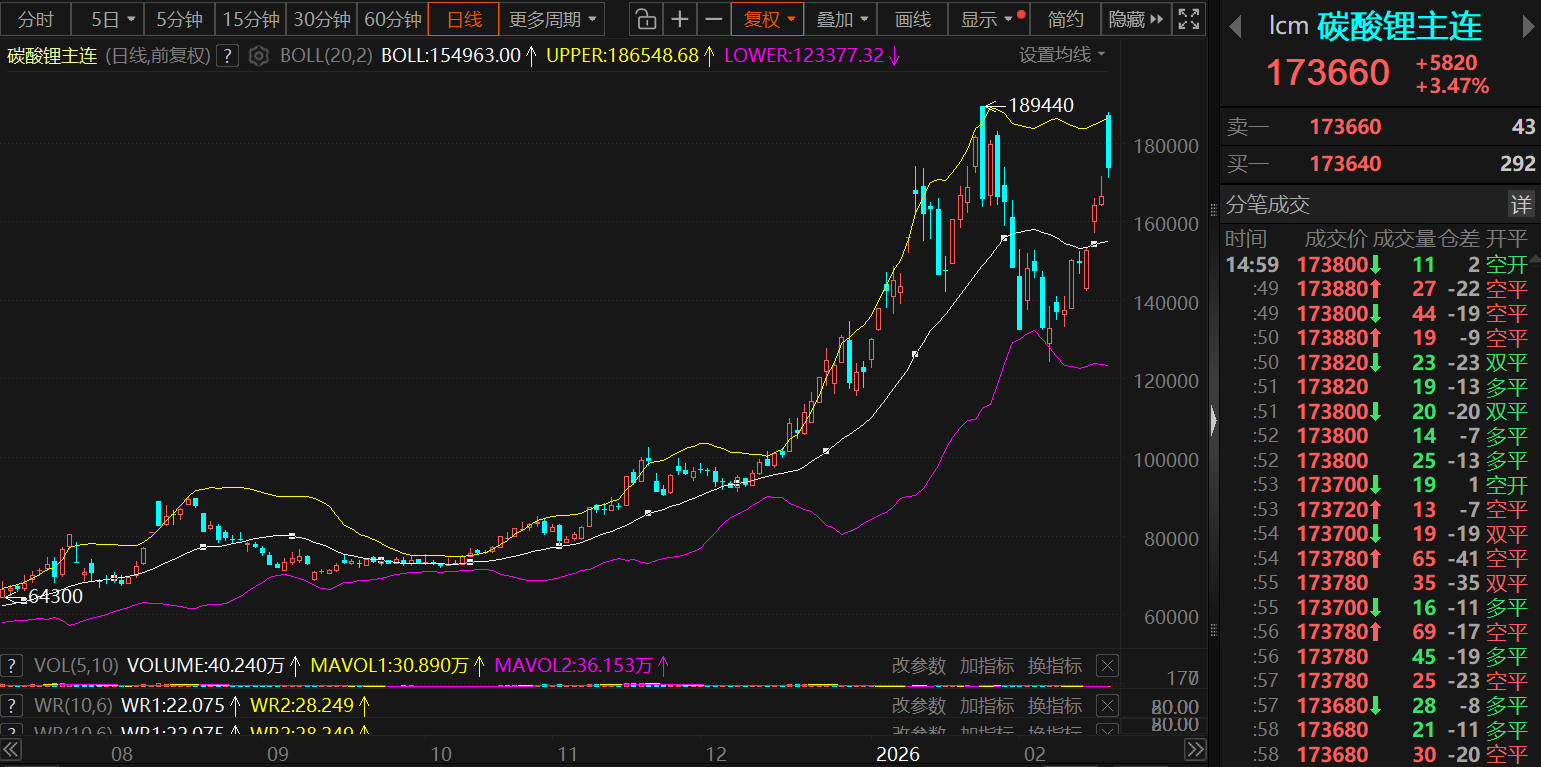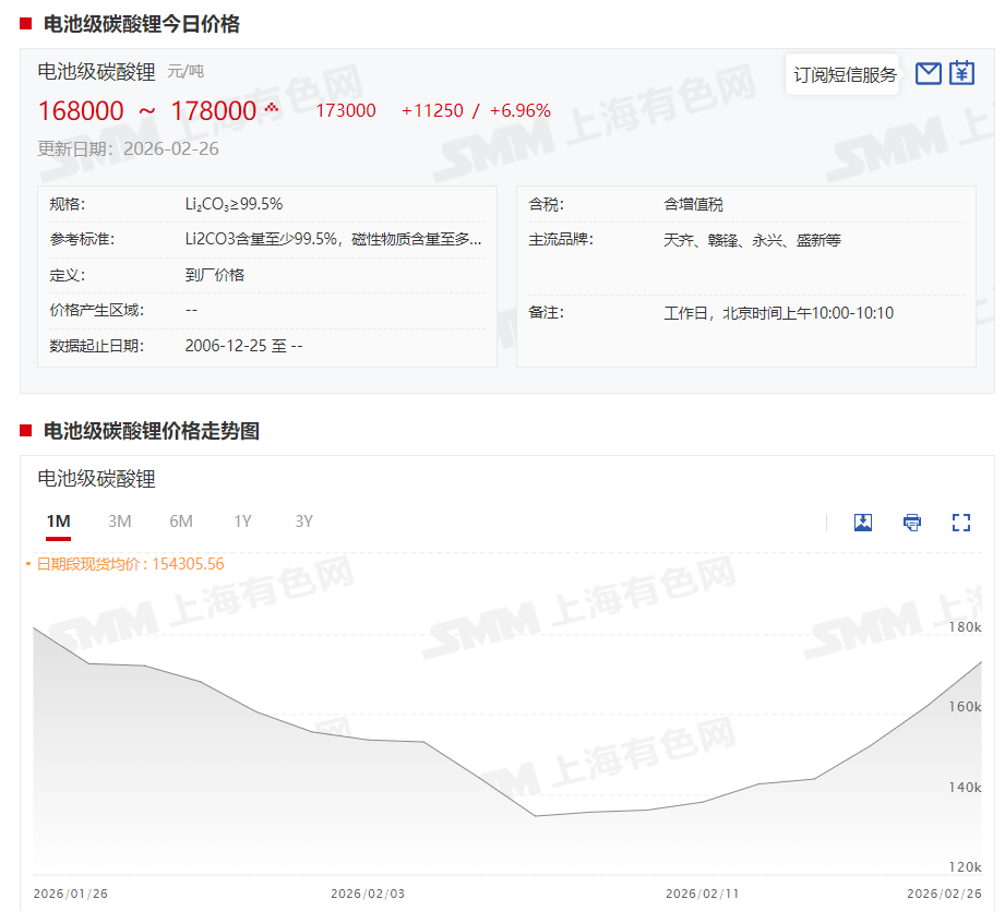 SMM 2月26日讯:自春节假期归来之后,受消息面多方扰动,碳酸锂期货连续三个交易日接连拉涨,2月26日盘中更是跳空高开,开盘涨幅一度高达11.42%,盘中最高一度攀升至187700元/吨,刷新1月26日以来的新高,但随后涨幅明显收窄,截至日间收盘,碳酸锂期货主连以3.47%的涨幅报173660元/吨。