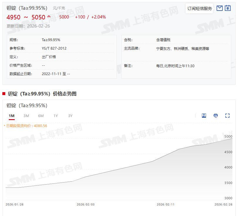 市场对全球钽市场供给端实质性收缩的担忧,带动钽价持续攀升!钽锭(Ta≥99.95%)2月26日的报价为4950~5050元/千克,其均价为5000元/千克,