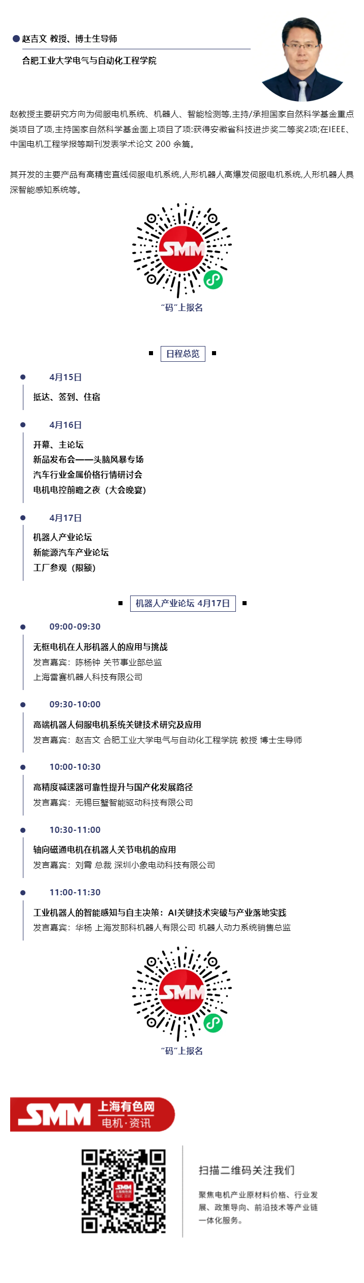 在将4月16-17日于上海·嘉定举办的SMM IEMC 2026电机电控产业前瞻大会上,我们邀请到了合肥工业大学电气与自动化工程学院 赵吉文教授围绕议题——《高端机器人伺服电机系统关键技术研究及应用》展开系统性分享与深入探讨。