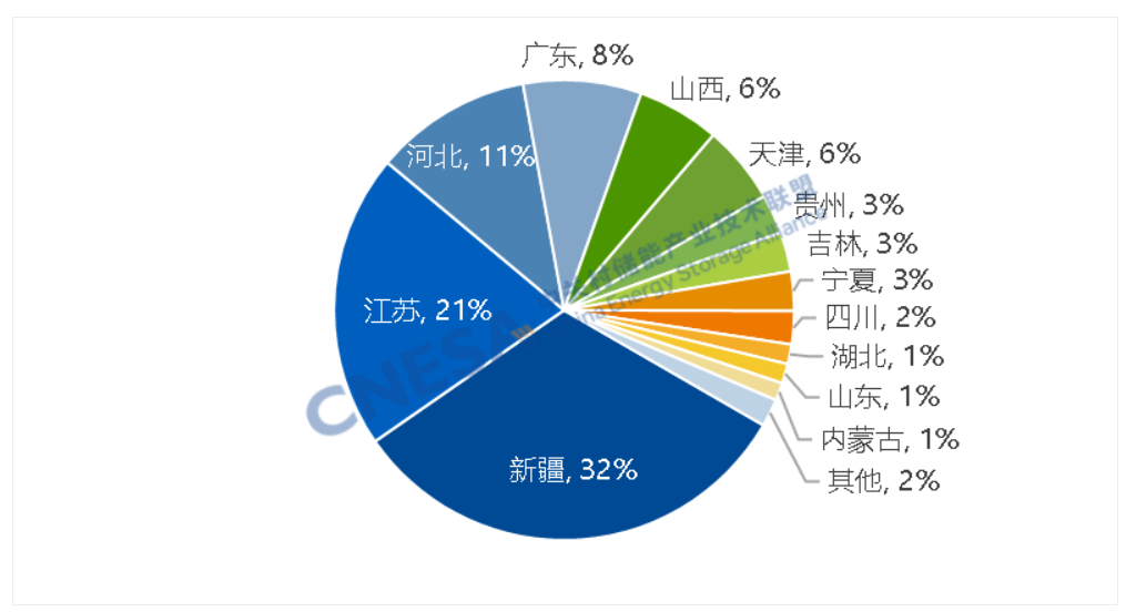 1月,西北地区规模占比35%,居全国首位。西北、华北地区新增装机合计占比超过全国的一半。从省份分布来看,新疆新增装机规模1.2GW/4.3GWh,功率规模和能量规模均居全国首位。