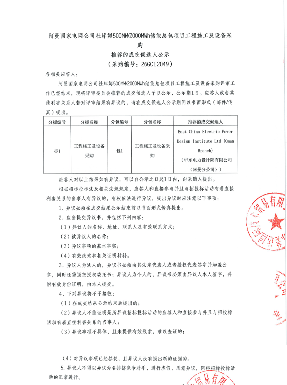 2026年2月25日,阿曼国家电网公司杜库姆500MW/2000MWh储能总包项目工程施工及设备采购推荐的成交候选人公示,中标候选人第1名为 East China Electric Power Design Institute Ltd(OmanBranch)(华东电力设计院有限公司(阿曼分公司))。该项目招标人为国电南瑞科技股份有限公司阿曼分公司。