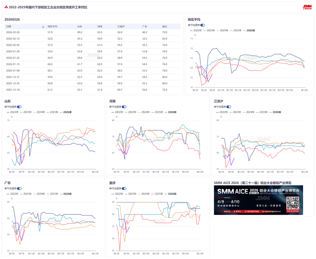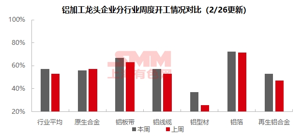 铝型材:本周国内型材开工率录得37%,环比回升11.5 个百分点。春节后首周,型材企业逐步进入复工复产阶段,开工水平较节前显著回升。分产品来看,建筑型材表现依旧偏弱。河北地区部分小型型材企业反映,当地建材市场竞争激烈,型材加工费出现不同程度下调,其中喷涂料加工费下滑幅度约 15%。工业型材方面,光伏型材表现相对亮眼。河北、安徽地区龙头企业春节期间维持部分产线运行,相关企业反馈预计3 月中旬前仍将保持高开工状态。展望下周,型材企业最晚复工节点集中在正月十五(3 月 3 日),已复工企业正逐步恢复正常生产节奏,预计下周型材开工率将继续回升。但需关注高铝价对下游终端下单及采购积极性的压制。SMM 将持续跟踪节后企业复工动态。