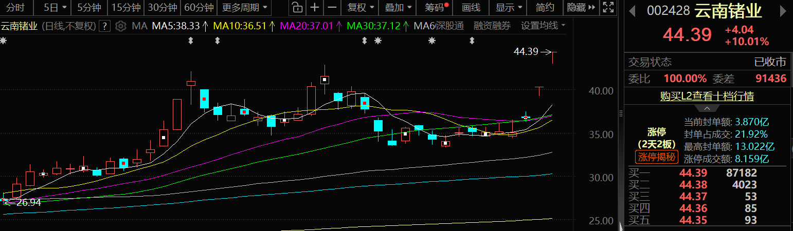 2月26日,云南锗业股价继续涨停,收获两连板,截至26日收盘,云南锗业涨10.01%,报44.39元/股。
