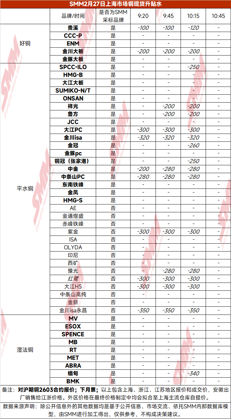 2月27日上海市场铜现货升贴水(第三时段)【SMM价格】