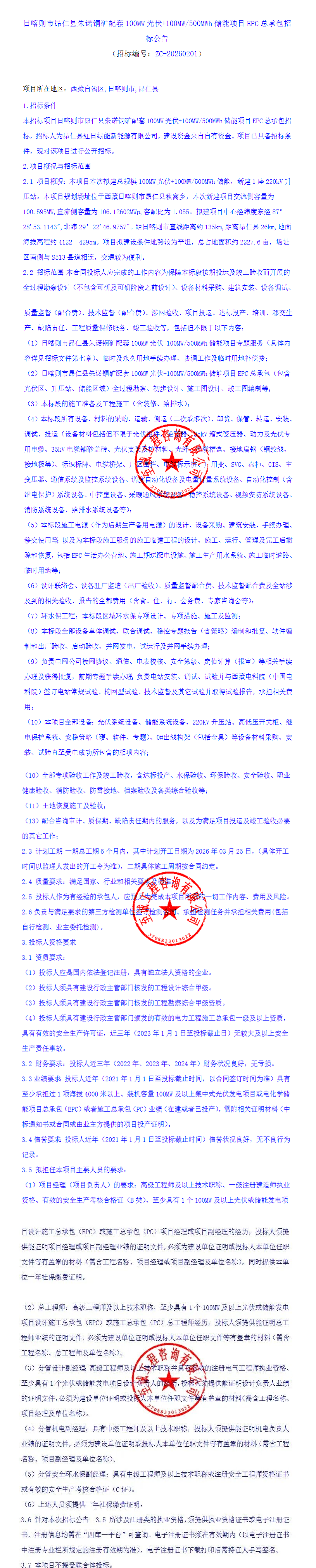 北极星储能网讯:2026年2月13日,西藏日喀则市昂仁县朱诺铜矿配套100MW光伏+100MW/500MWh储能项目发布EPC总承包招标公告,项目资金来源为自筹资金56000万元,招标人为西藏耀晖新能源全资控股的昂仁县红日绿能新能源有限公司。