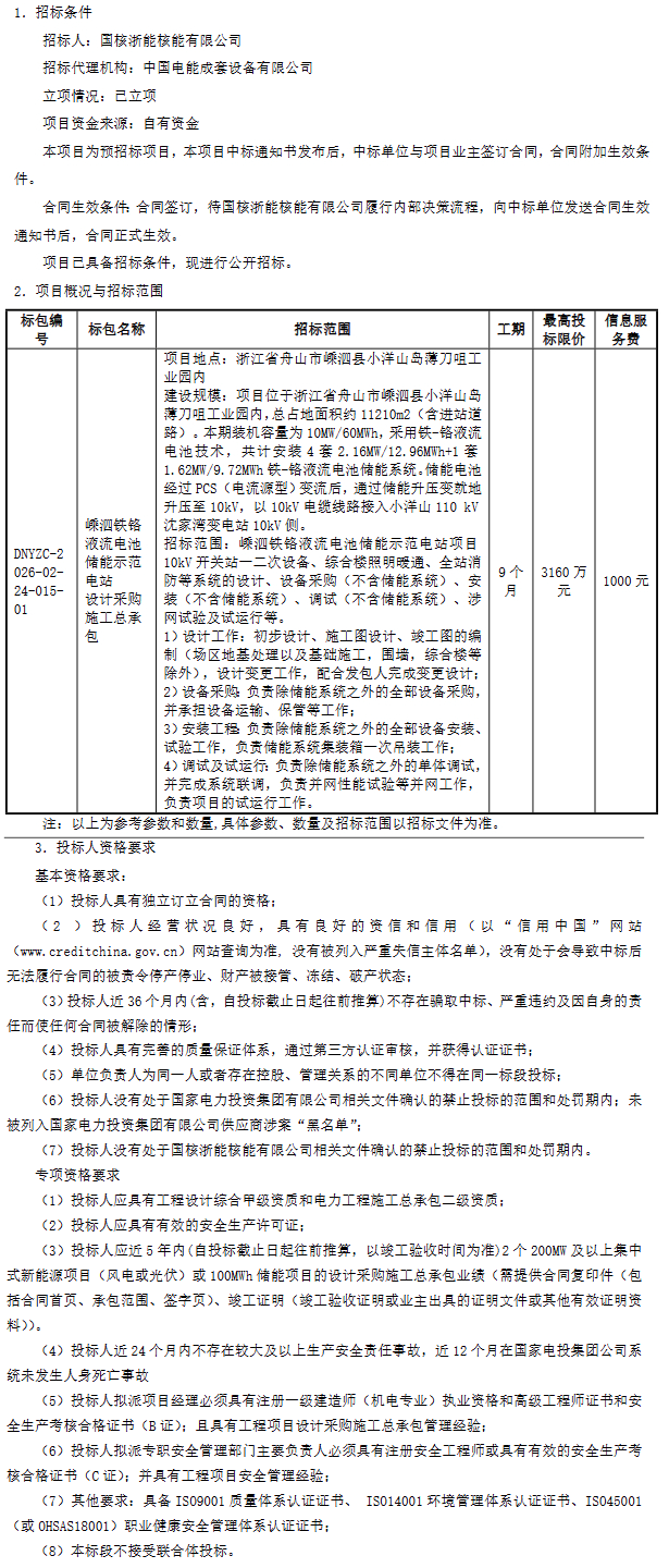 北极星储能网获悉,2月24日,国家电投国核浙能核能有限公司发布嵊泗铁铬液流电池储能示范电站EPC招标,最高投标限价3160万元,但本次采购不包含储能系统。