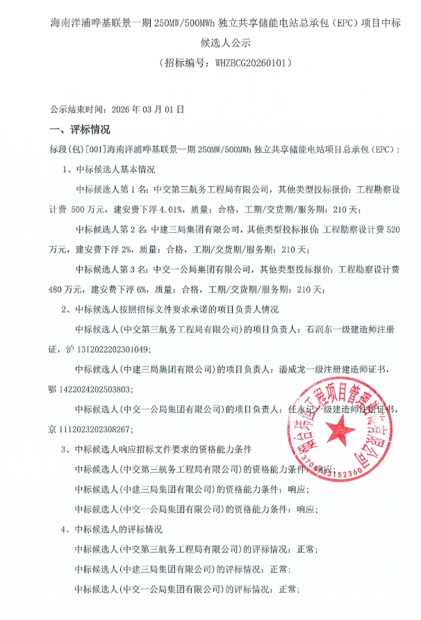 北极星储能网获悉,2月26日,海南洋浦哗基联景一期250MW/500MWh独立共享储能电站总承包(EPC)项目中标候选人公示,其中,中标候选人第1名为中交第三航务工程局有限公司,中标候选人第2名为中建三局集团有限公司,中标候选人第3名为中交一公局集团有限公司。