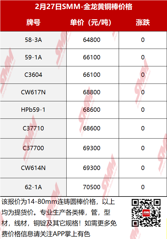 【SMM价格】2026年2月27日金龙黄铜棒价格