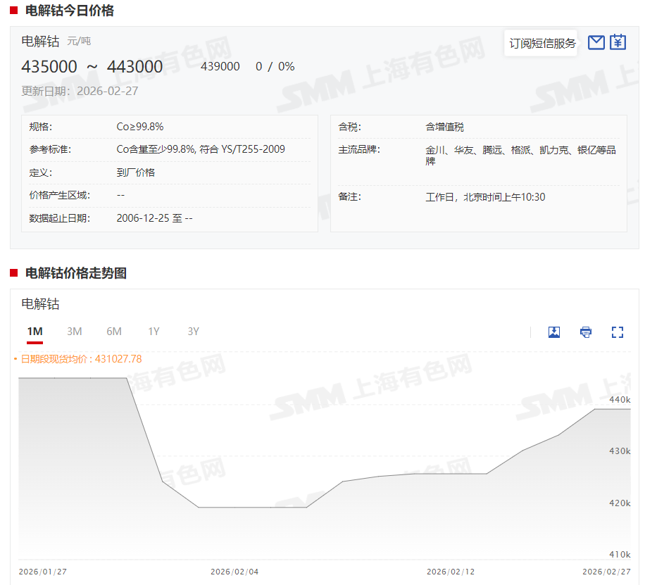 SMM 2月27日讯:春节假期归来之后的首周,钴系产品价格多维持稳定,不过电解钴因海外消息面等因素的影响单周上涨1.25万元/吨,而钴中间品价格也因出口进度偏慢,大规模到港时间存在持续推迟可能,或导致国内钴原料供应结构性偏紧态势进一步加剧而维持偏强运行……SMM整理了本周钴系产品的基本面变动情况,具体如下: