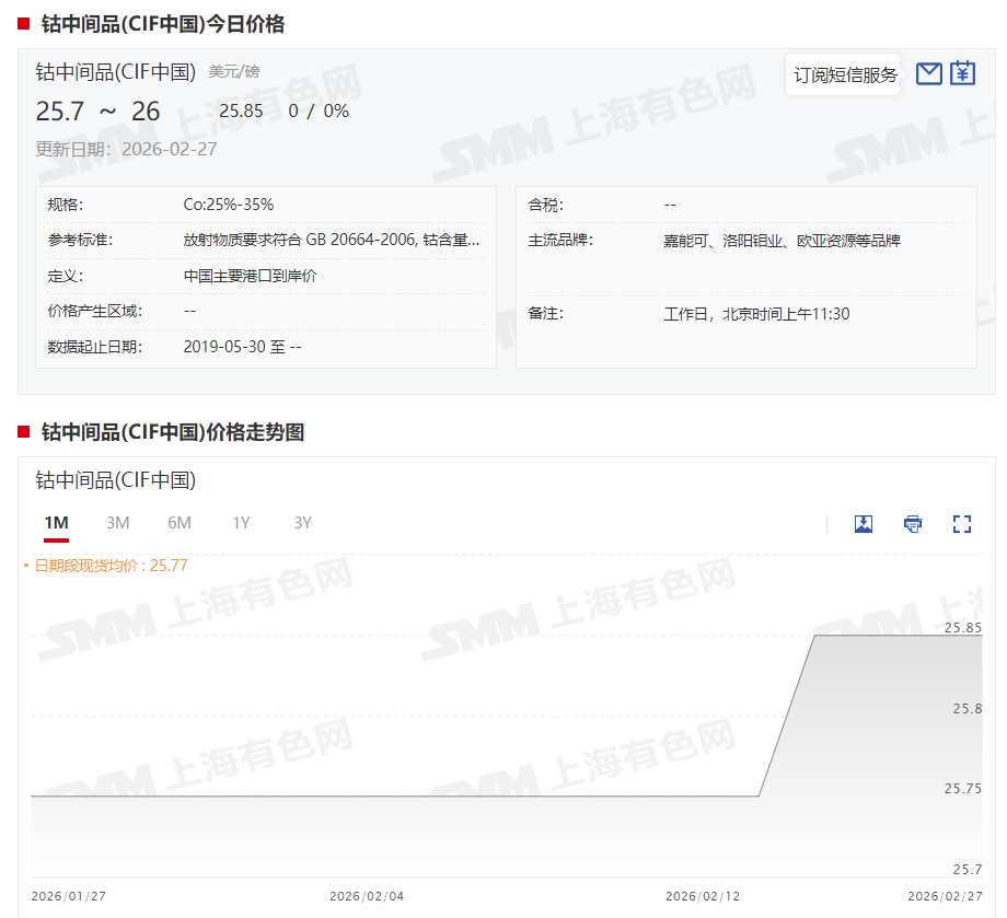 据SMM现货报价显示,节后首周,钴中间品(CIF中国)继续维持偏强运行态势,现货报价在节后归来首日上涨0.1美元/磅之后持稳运行,截至2月27日,其现货报价暂时持稳于25.7~26美元/磅。