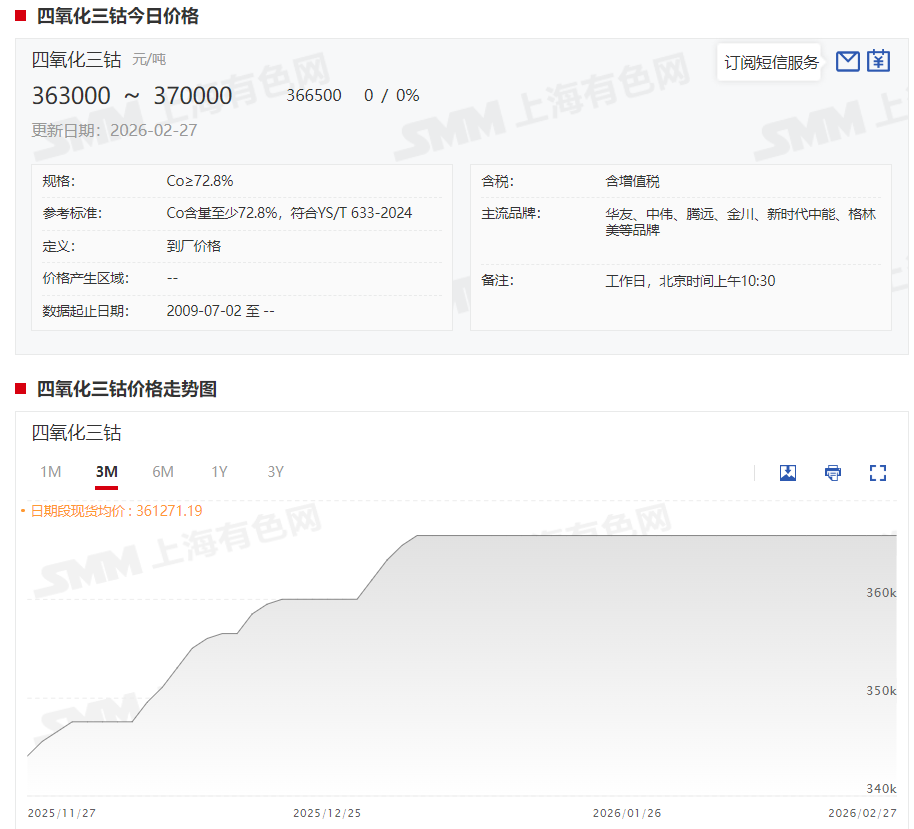 本周四氧化三钴头部企业报价维持在每吨37.0万元的高位,显示出较强的挺价信心。市场暂未出现成交。供应端来看,原料钴中间品库存吃紧的问题仍未缓解,冶炼厂依靠外采钴盐及回收料维持生产,成本支撑依然坚挺。需求端表现相对平淡,下游正极材料厂多以消耗节前备货为主。预计3月市场活跃将会有明显提升,四氧化三钴价格有望进一步上涨。