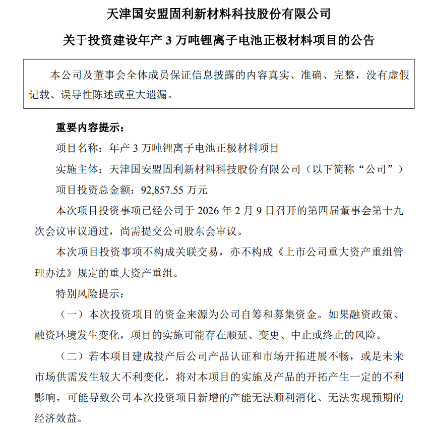 提及该项目投资对公司的影响,盟固利表示,本项目围绕公司主营业务展开,符合国家产业发展方向及公司整体发展战略,其实施有利于公司稳步扩大产能,以响应下游产业快速发展带来的新增需求,提高公司的市场份额并增强公司的核心竞争力,进而对公司的可持续发展能力和盈利能力起到良好的促进作用,符合公司长期发展需求及股东利益。