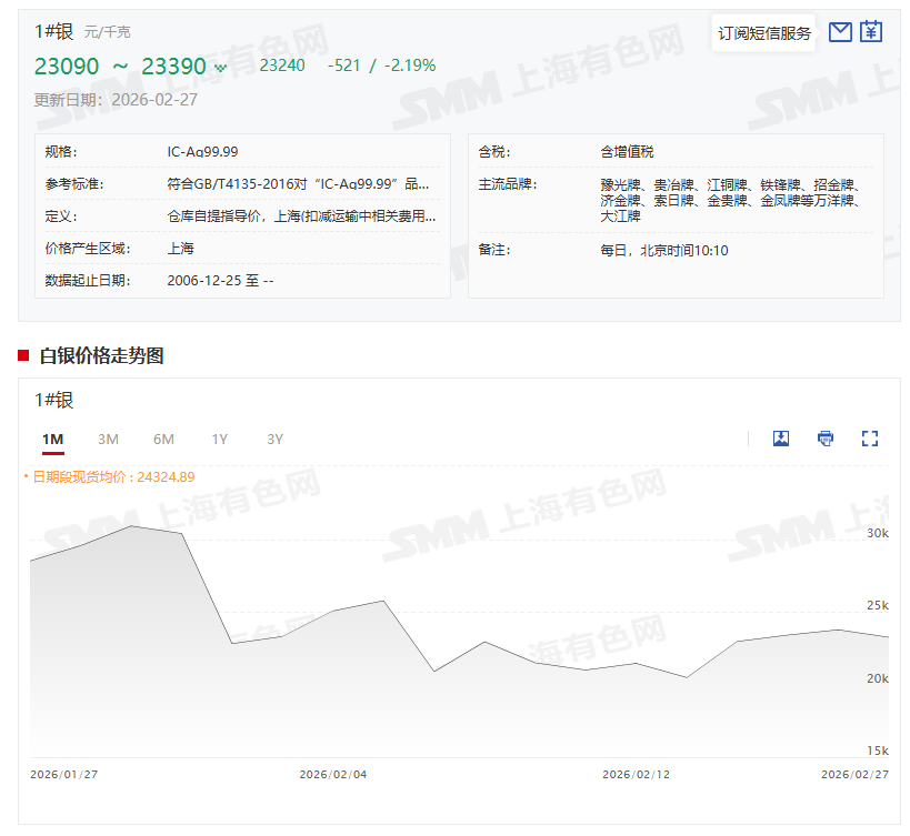 2月27日,SMM1#白银上午出厂参考均价为23240元/千克,均价较前一交易日跌521元/千克,跌幅为2.19%。据了解,27日银价延续震荡整理趋势,TD对沪银主力2604合约基差收窄后,部分持货商下调升水报价,但大厂银锭报价仍然坚挺。上海地区国标银锭持货商对TD升水下调至1400-1500元/千克报价刚需成交,上海、深圳地区部分持货商对TD升水1200-1400元/千克抛售库存,大厂银锭持货商对TD升水1500-1700元/千克溢价惜售。甘肃、广东、河南等地冶炼厂对TD升水下调至1500元/千克少量成交。今日市场现货市场流通货源增加,部分小厂银锭及进口的国产大锭品牌流入市场补充低端应用及首饰制品等市场需求,深圳地区升水降幅略大于上海市场,不同品牌银锭报价差异较大,与昨日相比高价成交相对困难,市场成交情况逐渐转暖。