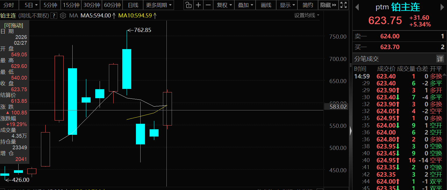 据新华社消息,当地时间2月26日,美国与伊朗在瑞士日内瓦举行第三轮间接谈判,此次谈判由阿曼斡旋,历经两个阶段,中间休会数小时。谈判结束后,伊朗和阿曼方面均表示,此轮谈判取得“良好进展”,美伊双方与各自政府磋商后,新一轮谈判预计于下周举行。美伊矛盾暂未继续激化,金价窄幅波动。纽银、铂、钯2月27日出现明显的上行,其中铂金本周周线涨19.29%,成为贵金属期货板块的亮眼品种。美国关税以及地缘风险带来的市场不确定性仍存,支撑着贵金属的走势。基本面上,白银、铂等供应偏紧给白银和铂带来基本面上的支撑。叠加不少市场参与人士看涨后市,部分持货商挺价惜售的心理较强,给铂钯等的上涨带来情绪面的支撑。截至2月27日15:58分左右,COMEX黄金涨0.06%,报5197.1美元/盎司;沪金主连跌0.09%,报1147.9元/克;COMEX白银涨3.49%,报90.645美元/盎司;沪银主连涨0.57%,报23019元/千克;白银T+D涨2.09%,报22369元/千克。此外,铂主连涨5.34%,报623.75元/克,其本周周线涨19.29%;钯主连涨2.77%,报464.85元/克,其本周周线涨10.86%。