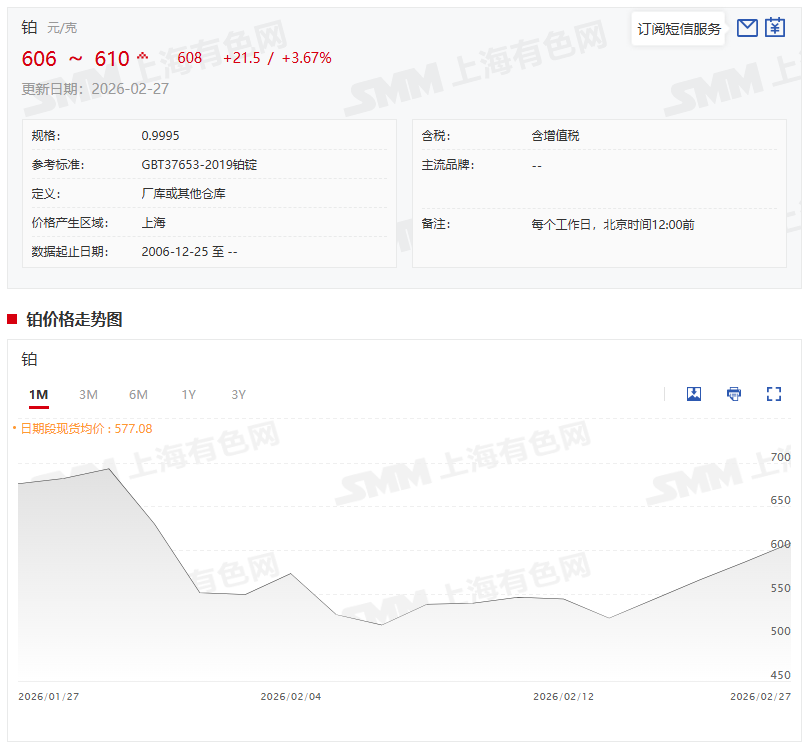 2月27日,铂现货报606~610元/克,其均价报608元/克,较前一交易日涨3.67%。节后归来铂的上涨除了宏观和避险需求的支撑,还受到基本面供应偏紧、市场预期向好,部分持货商挺价惜售等的支撑。由于部分持货商对后市保持乐观预期,使得其不愿低价出货,市场上低价货源难觅。不过,目前市场供需关系较节前未发生大的转变,节后的的上涨受乐观情绪的带动更为明显,下游高位观望情绪较重,预计短期铂价将继续震荡运行。后市还需关注需求端口的变化。