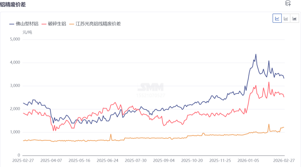 今日原铝现货较昨日报价下调110元/吨,废铝市场价格今日整体跟跌不一。精废价差方面,2月26日佛山型材铝精废价差3388元/吨,破碎生铝精废价差2511元/吨。江西、湖南、安徽等地今日选择观望,未进行调价。春节假期后,国内货场大多集中在初八至初十复工收发货,下游铝加工企业春节假期原料库存虽降至低位,存在补库需求,但2026年春节假期时间较往年有所延长,整体大规模补库动作存在滞后性,本周废铝出货暂未出现明显回暖信号。