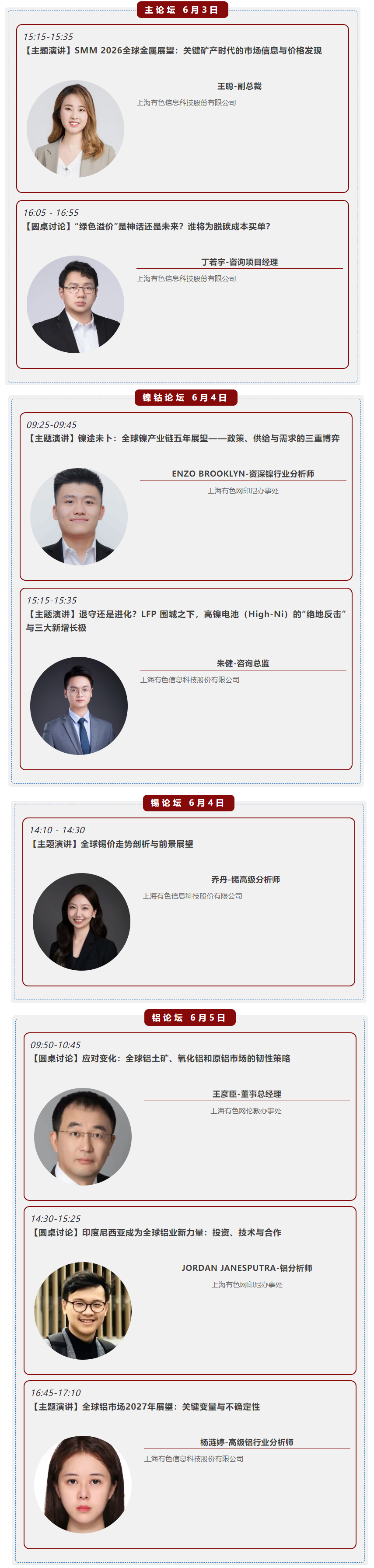 在此基础上设置的 SMM 分析专场,将通过多场主题演讲与圆桌讨论,集中呈现其对镍、钴、铝、锡及新能源材料等市场的供需结构、成本变化与价格趋势判断,为产业端与资本端提供具有参考价值的决策视角。