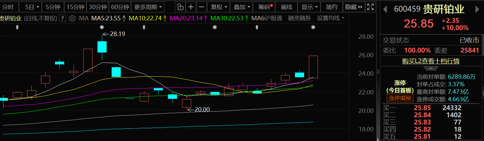 2月27日,贵研铂业以25.85元/股的涨停价报收。