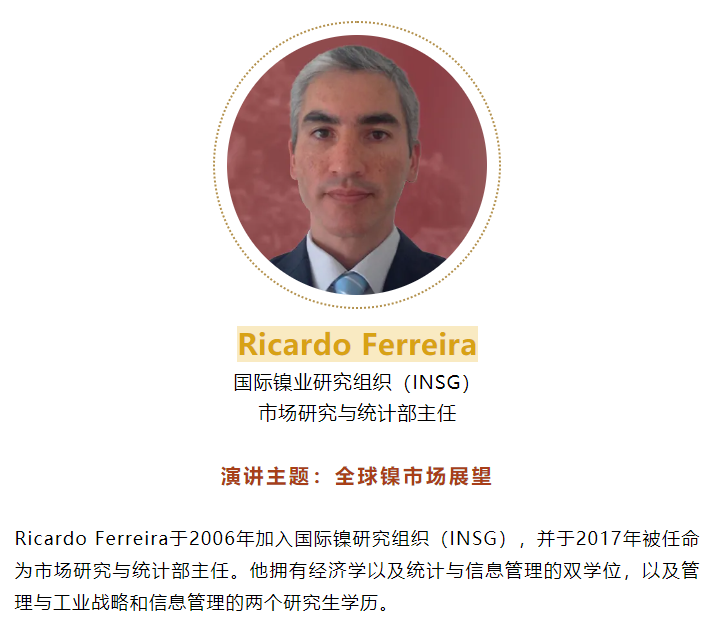 来自International Nickel Study Group(INSG)的市场研究与统计部主任 Ricardo Ferreira 将带来单人演讲 《全球镍市场展望》,以官方供需与库存数据为基础,拆解当前结构变化与未来趋势。
