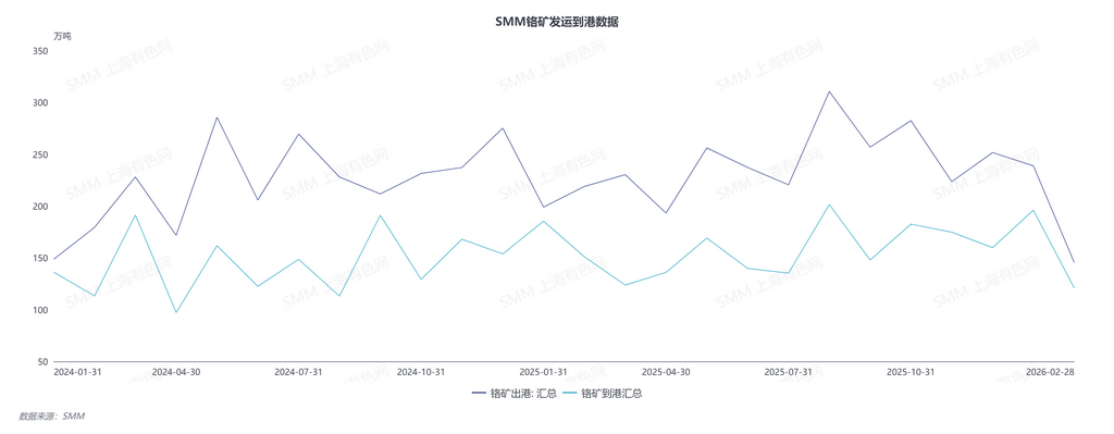 南非,津巴布韦正处雨季,受洪水影响,铬矿开采与运输受限,出货节奏放缓。据SMM数据统计,截止到2月26日,全球铬矿散货发运量为213.32万吨,环比减少4.31%;2月预计到港量为146.53万吨,环比减少8.26%。