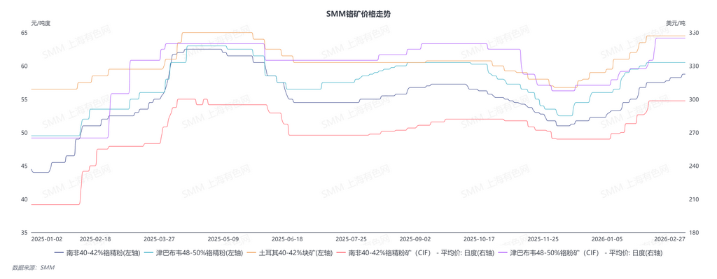 春节期间,国内铬铁厂家基本维持正常生产,据SMM数据统计,2026年2月我国高碳铬铁产量环比微降5.33%,同比涨幅达50.58%。当前下游厂家多以消耗节前原料库存为主,但考虑到后市“金三银四”消费旺季刺激,铬铁新增产能集中投产,整体产量维持高位运行,有回升预期,对铬矿采买需求有待释放,支撑铬矿价格进一步上行。