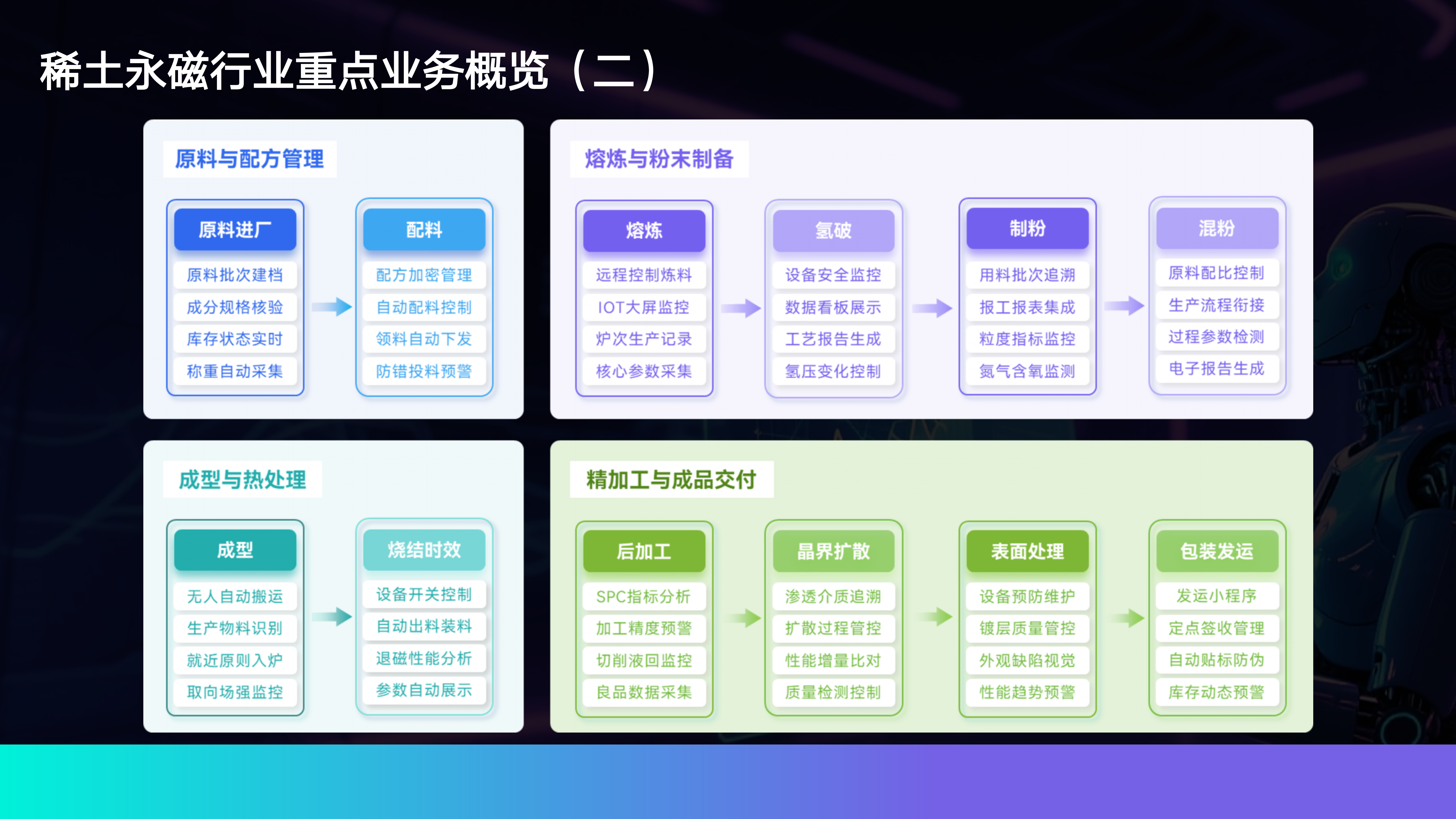 针对稀土永磁材料企业在原料管理、配方设计、熔炼控制、粉末制备、成型热处理、精加工、仓储物流、质量追溯等环节中的实际痛点,才匠智能推出全生命周期一体化解决方案,实现“从原料到成品”全流程可视化、透明化、标准化管理,显著提升产线效率与产品一致性。