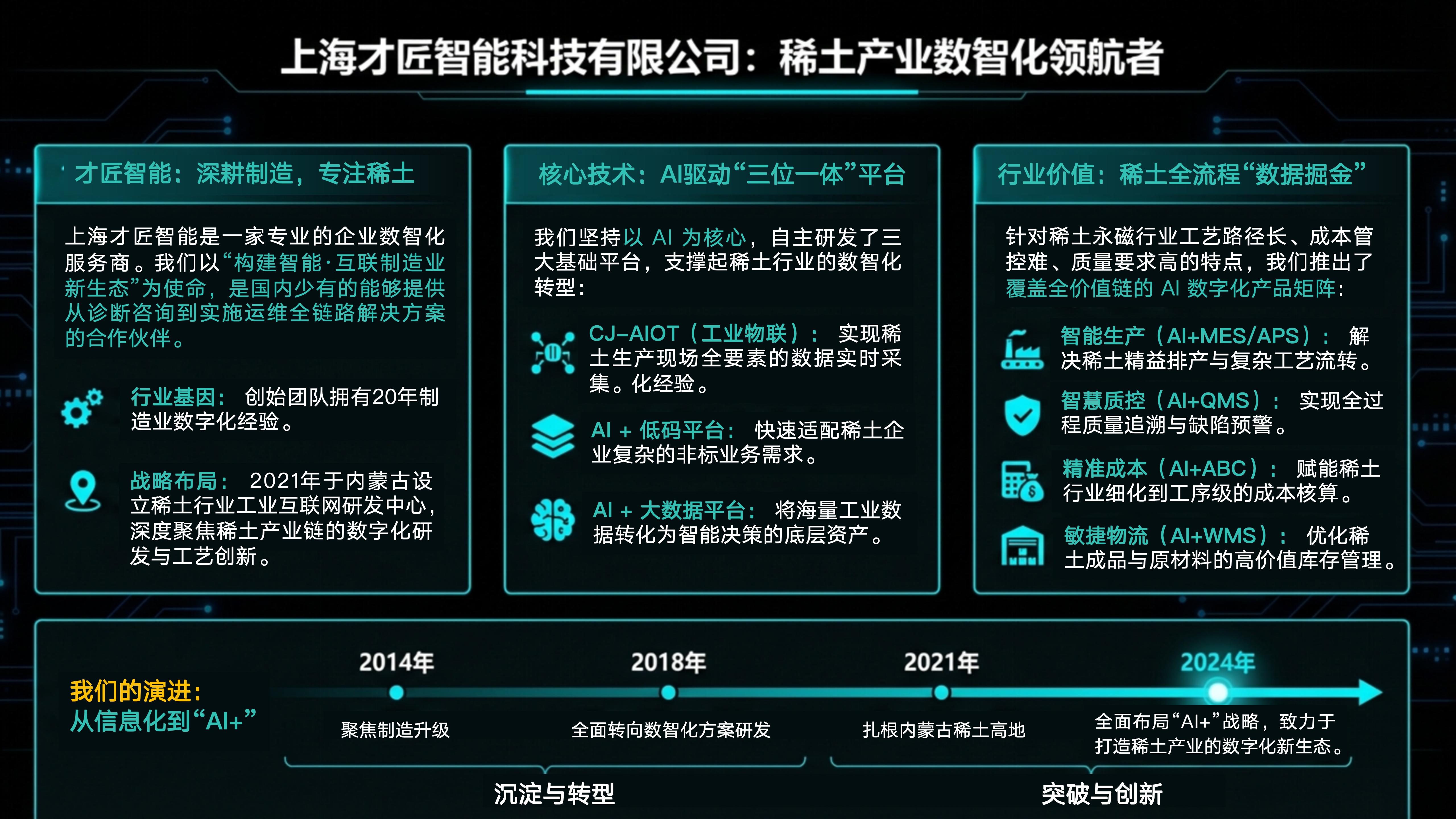 结合在稀土及先进制造领域的服务积累,才匠智能将呈现对行业业务逻辑、管理痛点与数字化需求的深入理解,进一步强化了与行业客户开展深度合作的基础。