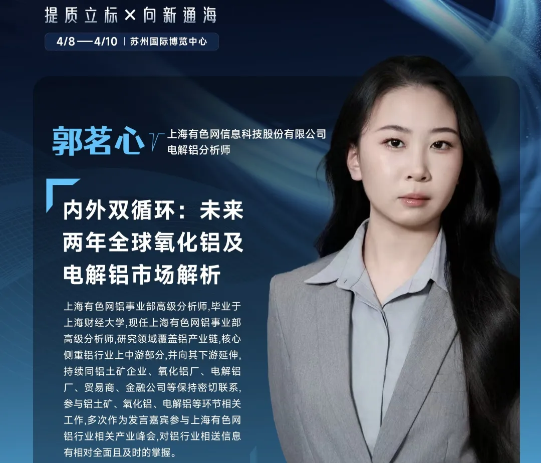 在此行业背景下,2026年4月8日,SMM AICE 2026铝产业博览会特邀上海有色网信息科技股份有限公司电解铝分析师郭茗心女士,带来《内外双循环:未来两年全球氧化铝及电解铝市场解析》专题论坛。