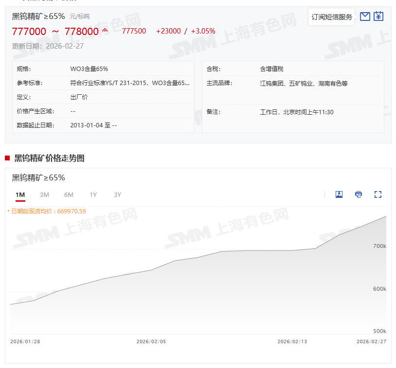 进入2026年,钨价继续攀升!春节后钨市场迎来开门红,市场再度进入加速上涨行情,屡创新高,产业链上下游联动,矿端及冶炼端上游产品供应紧张难以改善,价格突飞猛进,下游硬质合金、高速钢等行业原料库存低位的情况下,倒逼企业频繁调整产品销售价格。2月27日,黑钨精矿(≥65%)价格为777000~778000元/标吨,其均价的历史新高也刷新至777500元/标吨,年内累计上涨71.4%,同比上涨443.7%。