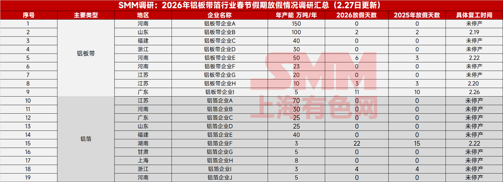 据SMM调研了解,2026年春节后铝板带箔行业生产韧性凸显,行业复工呈现梯度推进态势,龙头企业集中在正月初三(2.19)至正月初六(2.22)复工出货,中小型企业则多在正月初八(2.24)至正月十五(3.3)逐步开工。节后首周行业复工节奏偏缓,部分企业完成设备检修后陆续复工。下游复苏分化,建筑领域回暖滞后,幕墙板等订单不足;罐料、汽车板、航空板等高端产品订单稳定,铝箔企业受下游客户复工带动,订单逐步攀升,食品包装箔、药箔需求平稳,叠加电池抢装需求支撑开工率。