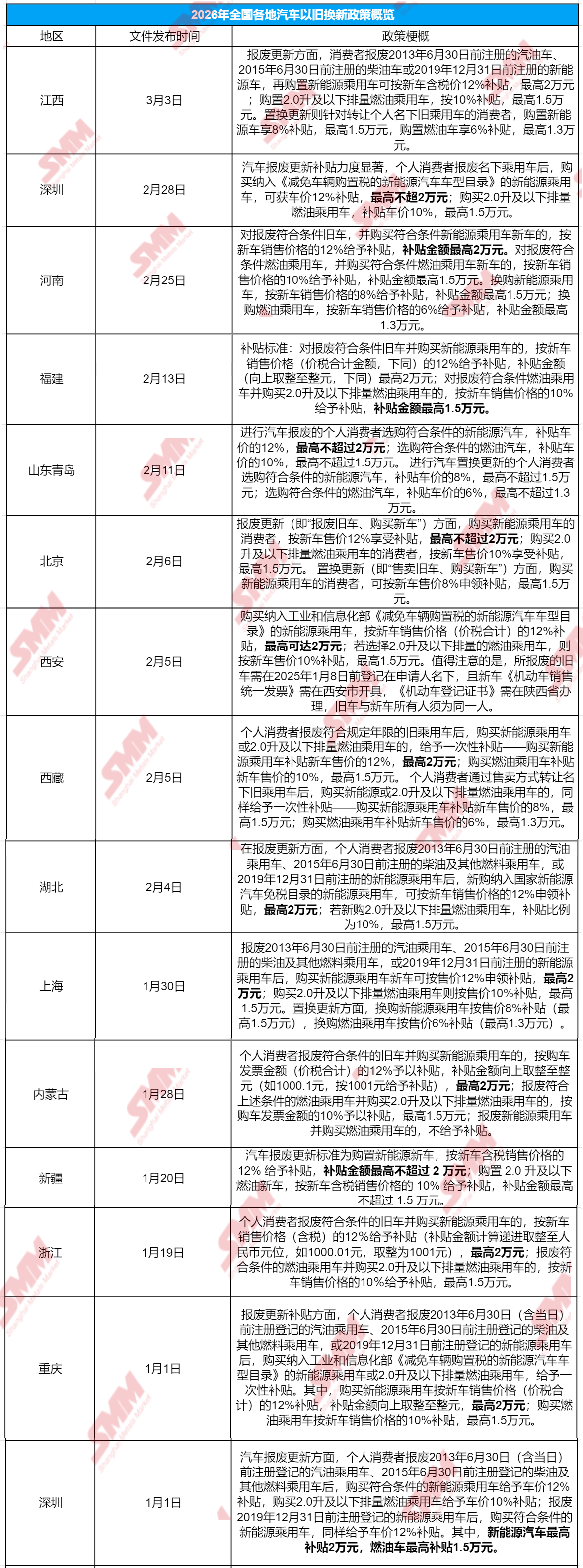 而据SMM不完全统计,进入2026年2月份,依旧有不少省市陆续发布汽车以旧换新细则,SMM整理如下: