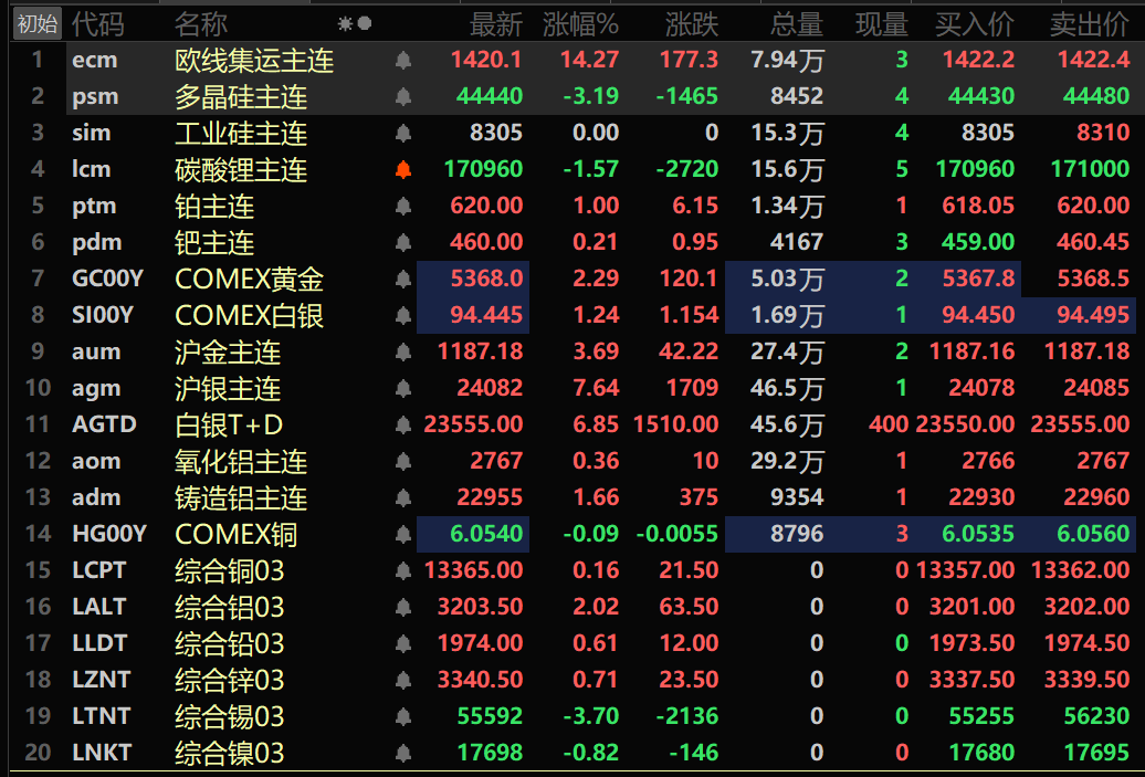 贵金属方面,截至11:40分,COMEX黄金涨2.29%,COMEX白银涨1.24%。内盘贵金属方面:沪金主连涨3.69%,沪银主连涨7.64%。