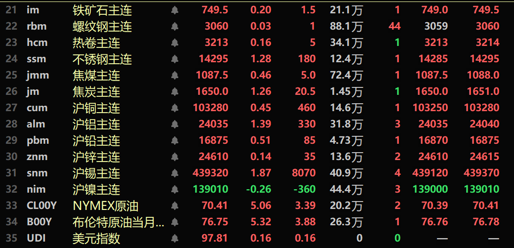 黑色系均飘红,铁矿涨0.2%,螺纹微涨,热卷涨0.16%,不锈钢涨1.28%。双焦方面:焦煤主力合约涨0.46%,焦炭主力合约涨1.26%。