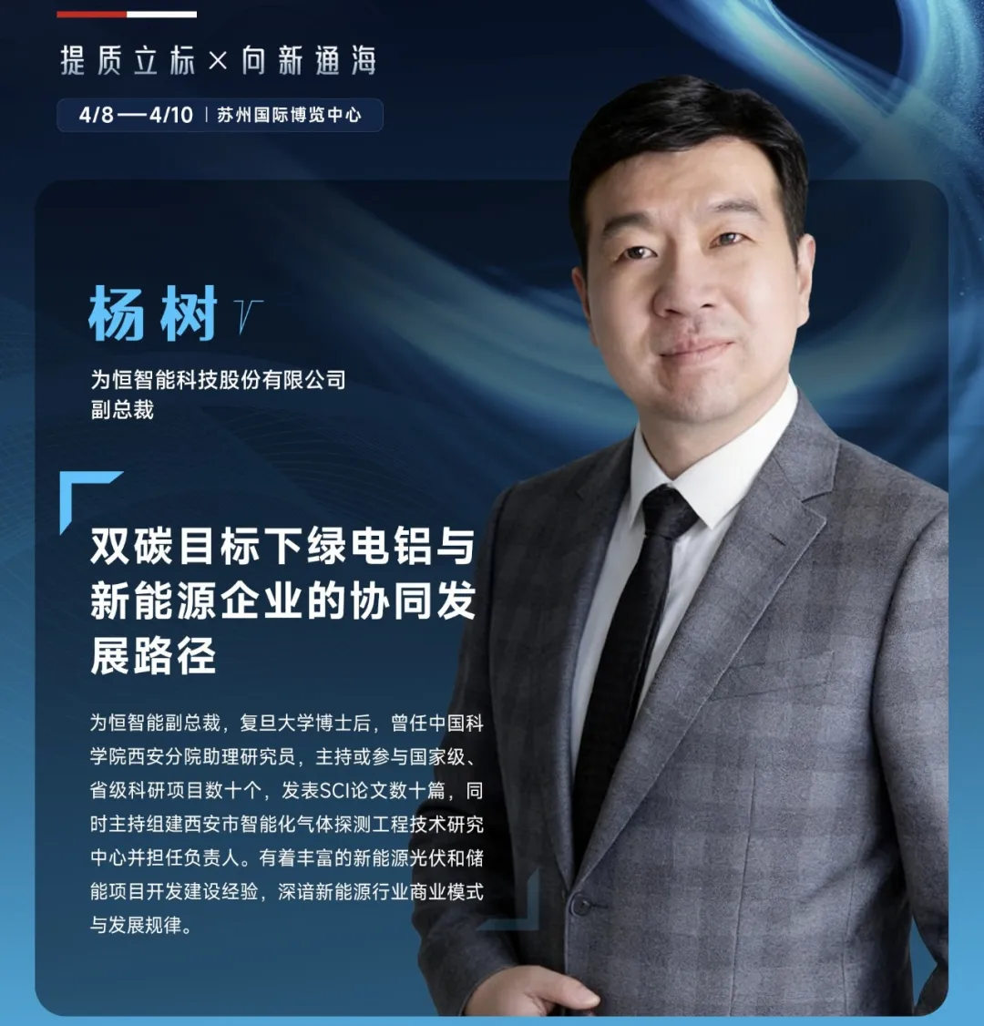 2026年4月8日,SMM AICE2026铝产业博览会特邀为恒智能科技股份有限公司副总裁杨树先生带来《双碳目标下绿电铝与新能源企业的协同发展路径》专题论坛。作为深耕新能源领域的行业专家,杨树先生拥有丰富的新能源光伏和储能项目开发建设经历,他对铝产业与新能源融合的核心逻辑有着深刻理解。
