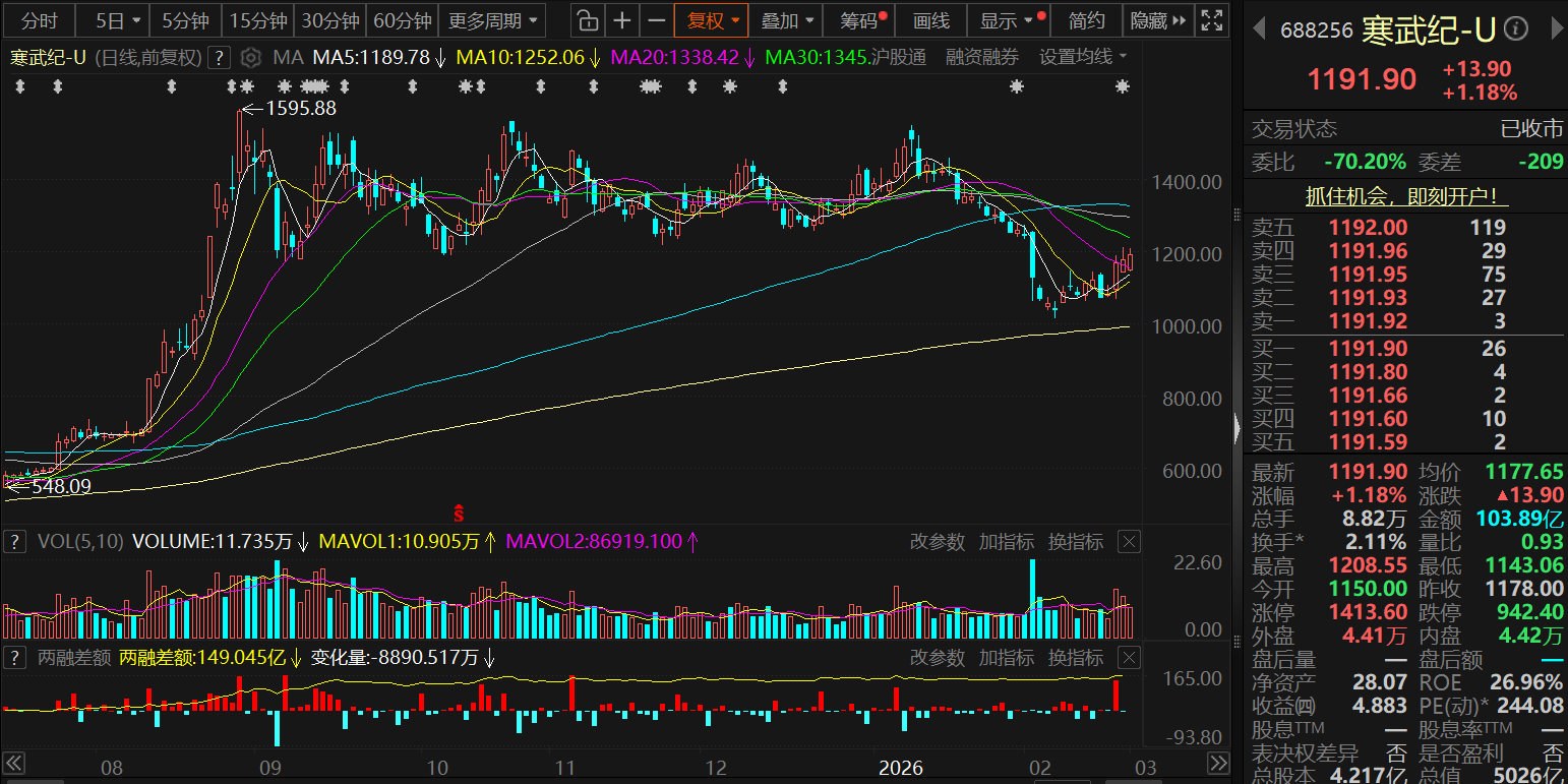 3月2日开盘,寒武纪-U股价最终以1.18%的涨幅报1191.9元/股。