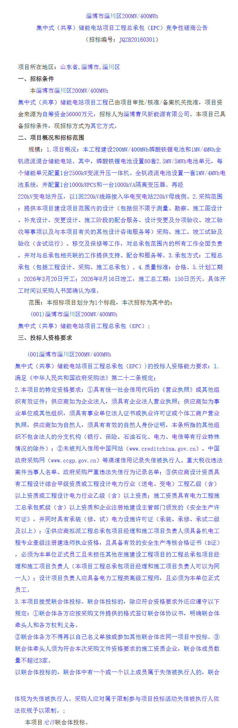 北极星储能网讯:2026月3月1日,山东淄博市淄川区200MW/400MWh集中式(共享)储能电站项目工程总承包(EPC)发布招标公告,项目资金来源为自筹资金56000万元,合单价1.4元/Wh。招标人为淄博青风新能源有限公司。
