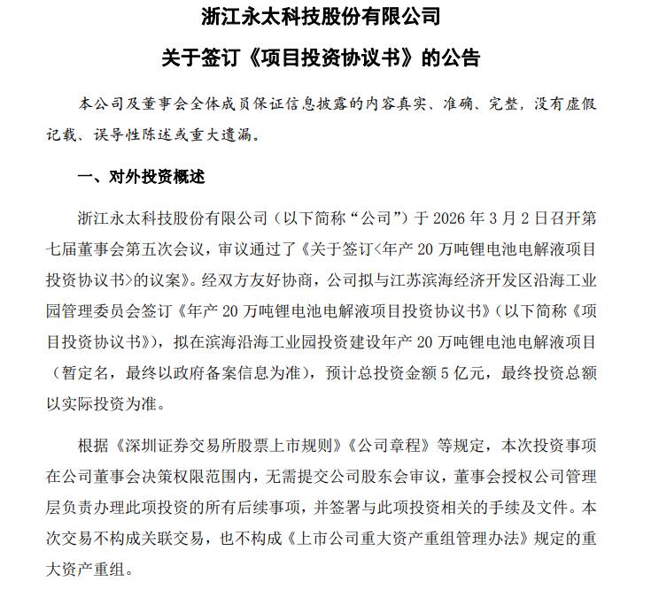 SMM 3月3日讯:近日,永太科技发布《关于签订<年产 20 万吨锂电池电解液项目投资协议书>的议案》,其中提到,经双方友好协商,公司拟与江苏滨海经济开发区沿海工业园管理委员会签订《年产 20 万吨锂电池电解液项目投资协议书》,拟在滨海沿海工业园投资建设年产 20 万吨锂电池电解液项目(暂定名,最终以政府备案信息为准),预计总投资金额 5 亿元,最终投资总额以实际投资为准。