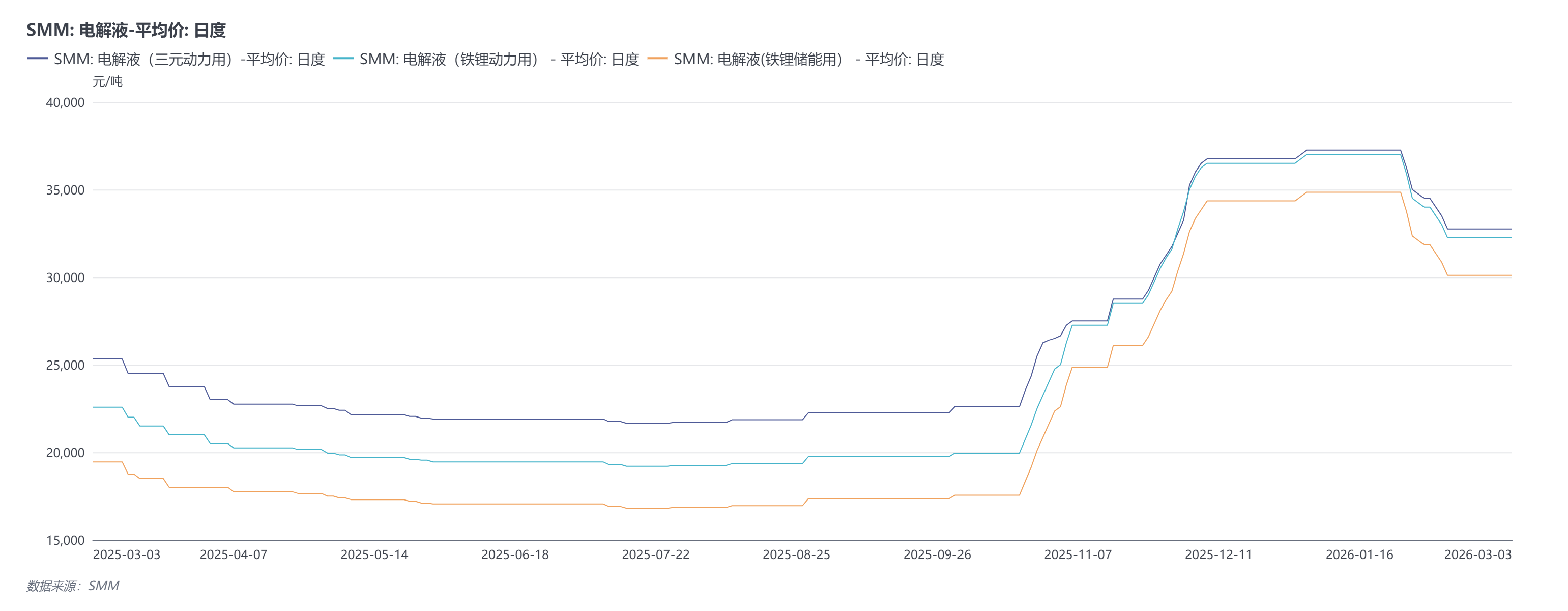 截至3月3日,电解液(三元动力用)现货报价维持在31000~34500元/吨,均价报32750元/吨;电解液(铁锂储能用)现货报价维持在28500~31700元/吨,均价报30100元/吨;电解液(铁锂动力用)现货报价维持在31000~33500元/吨,均价报32250元/吨。