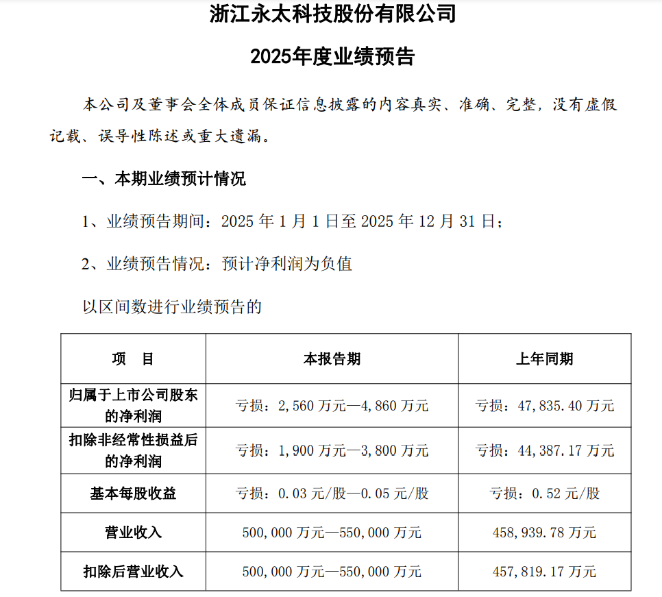 而1月底,永太科技还发布了其2025年业绩预告,预计公司2025年实现归属于上市公司股东扣除非经常性损益后的净利润同比减亏约 40,587–42,487 万元,亏损幅度收窄 91.44%–95.72%,经营效益呈现显著改善态势。