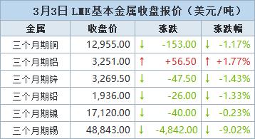 伦敦时间3月3日17:00(北京时间3月4日01:00),LME三个月期铝上涨56.5美元,或1.77%,收报每吨3,251美元,盘中触及3,315美元,创1月29日以来新高。