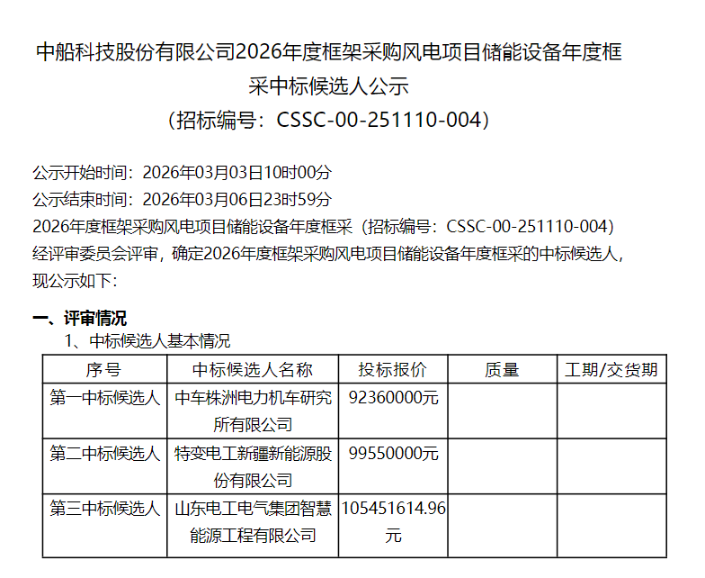 北极星储能网讯:2026年3月3日,中船科技发布2026年度框架采购风电项目储能设备年度框采中标候选人公示,前三名中标候选人依次为中车株洲电力机车研究所有限公司、特变电工新疆新能源股份有限公司、山东电工电气集团智慧能源工程有限公司,投标报价分别为92360000元、99550000元、105451614.96元。