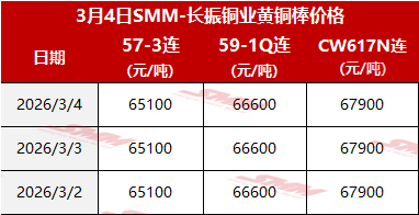 【SMM价格】2026年3月4日长振黄铜棒价格