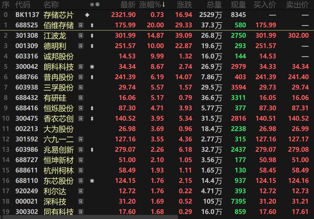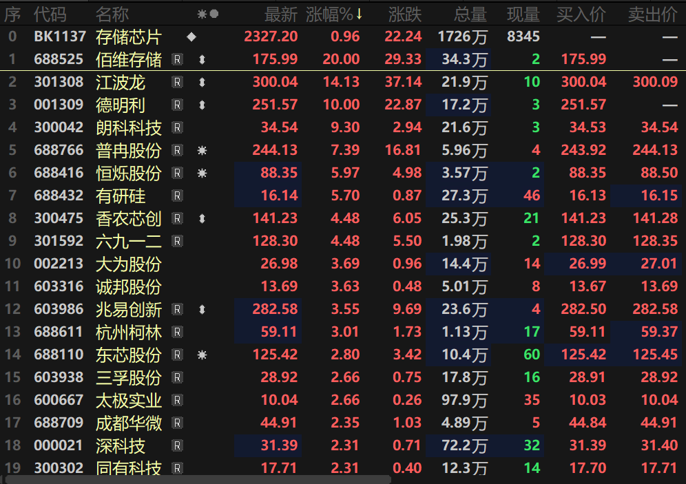 SMM 3月4日讯:3月4日早间,存储芯片板块今日早间也一同走高,其指数盘中一度涨近3%,个股方面,佰维存储盘中20CM涨停,江波龙盘中涨逾15%,德明利盘中一度封死涨停板,伟测股份、普冉部分等多股纷纷涨逾6%。大为股份、诚邦股份等多股一同涨逾3%。
