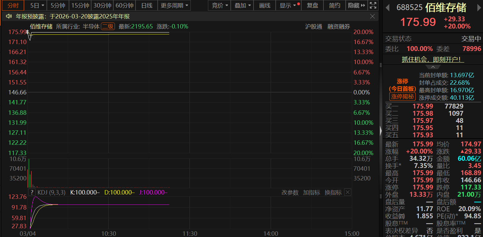 消息面上,今日开盘三分钟后便快速封死涨停板的佰维存储昨日晚间发布了2026年1~2月业绩预告,公告显示,经财务部门初步测算,深圳佰维存储科技股份有限公司预计 2026 年 1 月-2 月实现营业收入40至45亿元,与上年同期相比,将增加30.91~35.91亿元,同比增长 340.00%至 395.00%。预计公司2026年前两个月实现归属于上市公司股东的净利润在15~18亿元,相比去年同期同比增加 921.77%至 1086.13%。